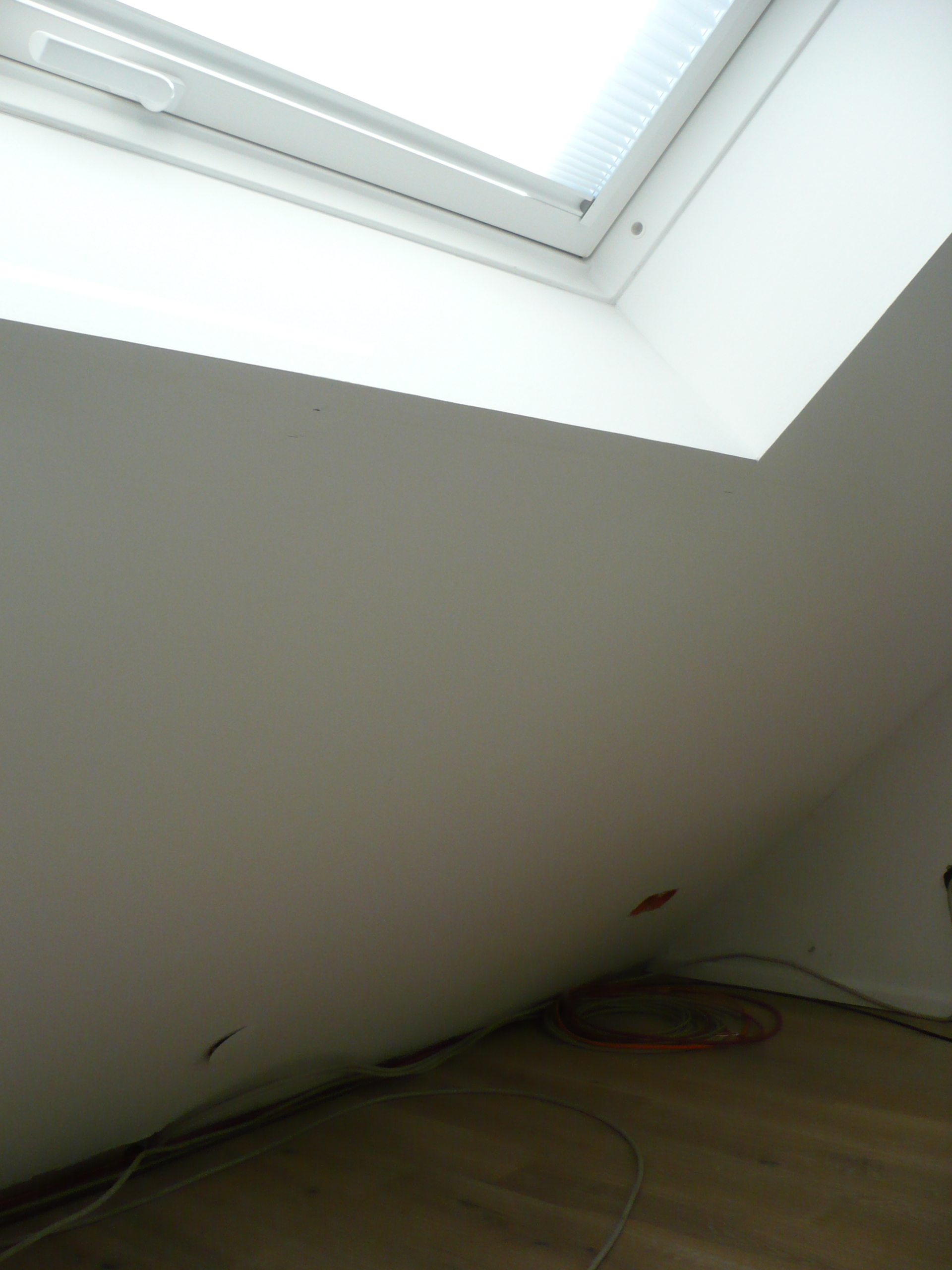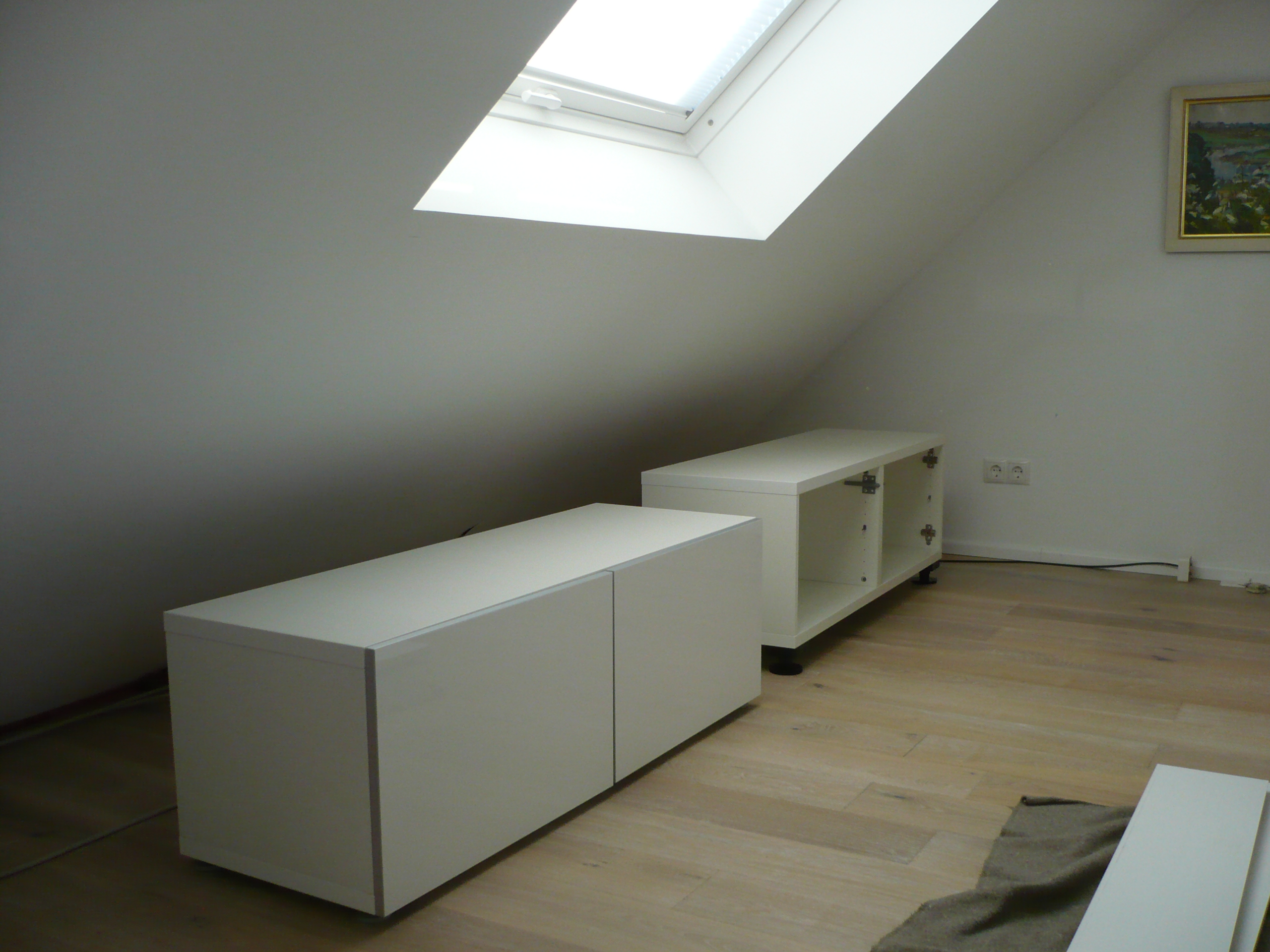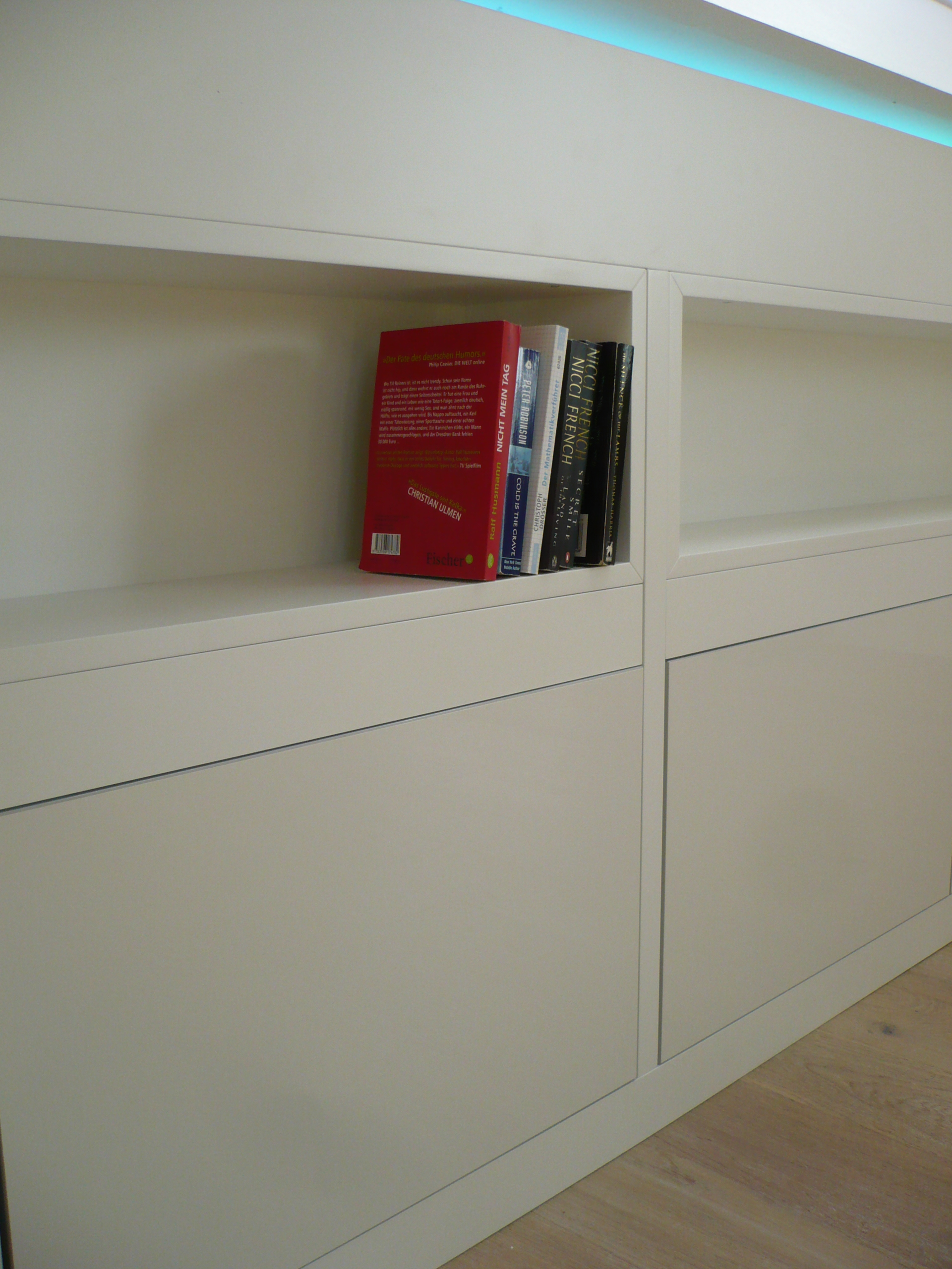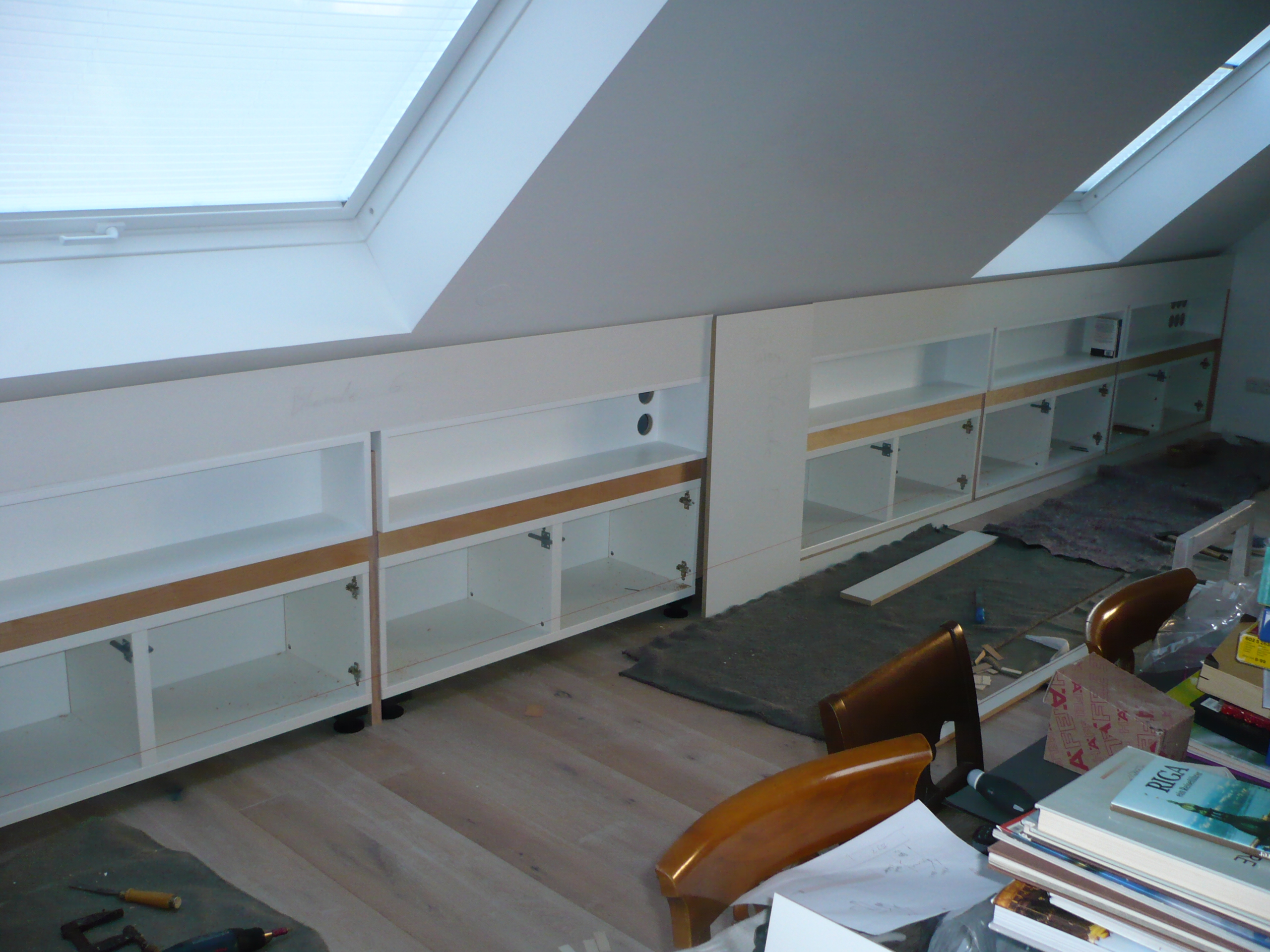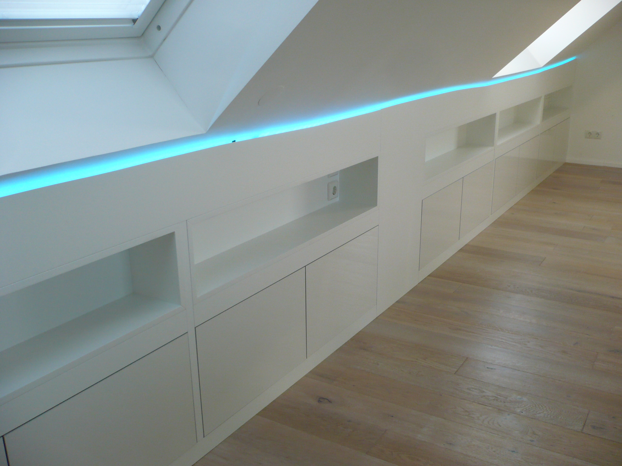 Kniestockverkleidung über 8 Meter Länge, mittels vorhandener Türcontainer mit zusätzlich angefertigten Regalcontainern, die in die lackierte Verkleidung eingebaut wurden. Ein zusätzliches LED-Band in der Schattenfuge kann für gewünschte Stimmung sorgen. (Die unebene Dachkonstruktion war leider bereits fertig.)